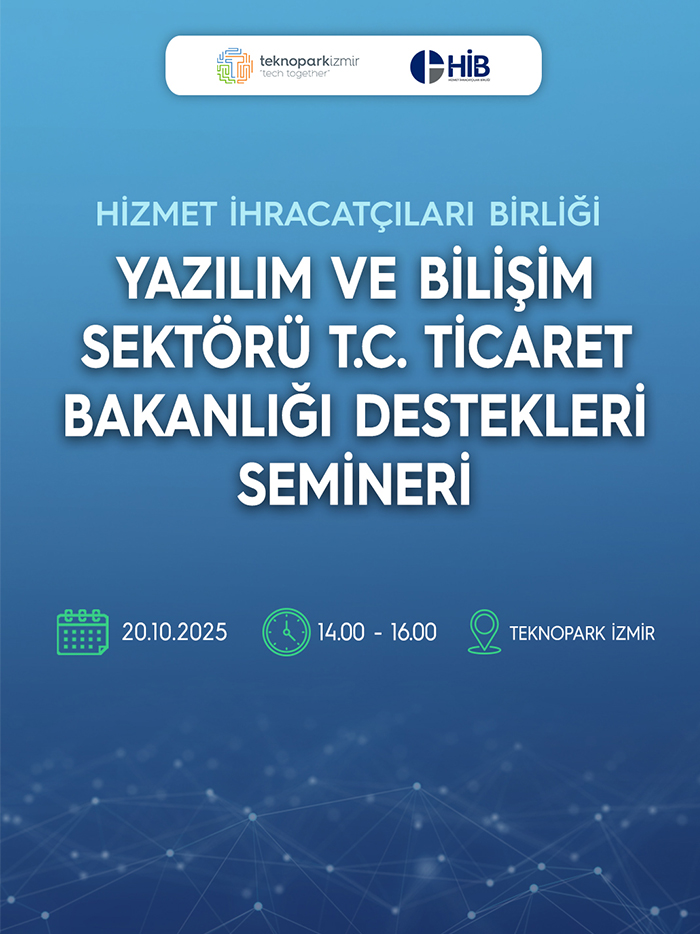 Hizmet İhracatçıları Birliği’nin (HİB) sunumuyla “Yazılım ve Bilişim Sektörü T.C. Ticaret Bakanlığı Destekleri Semineri” Teknopark İzmir İnovasyon Merkezi’nde gerçekleştirilecektir. Seminere, girişimcilerimiz, Ar-Ge firmalarımızın yöneticileri ve çalışanları ile tüm ilgililer davetlidir.