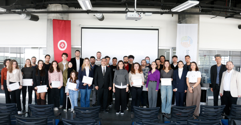 Akademiyi başarıyla tamamlayan Girişimci adayları sertifikalarını İYTE Rektör Yardımcısı Prof. Dr. Elif Uğurlu Sağın ve Teknopark İzmir Genel Müdürü Dr. Sinan Yılmaz’ın elinden aldı.