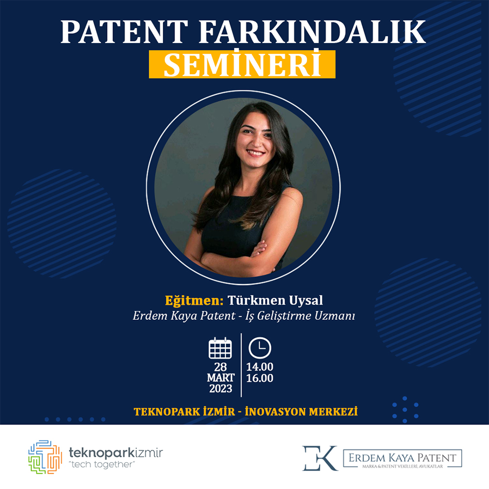 Teknopark İzmir ve Erdem Kaya Patent iş birliğinde, İş Geliştirme Uzmanı Türkmen Uysal’ın sunumuyla 28 Mart 2023 Salı günü “Patent Farkındalık Semineri” gerçekleştirilecektir.