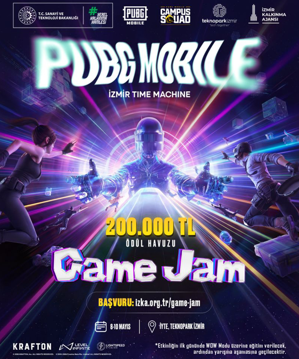 İzmir Kalkınma Ajansı, PUBG MOBILE ve Teknopark İzmir iş birliğiyle, İzmir’in kültürel mirasını oyun dünyasının yenilikçi teknolojileriyle buluşturacak olan PUBG MOBILE x İzmir Time Machine Game Jam etkinliğine davetlisiniz.
