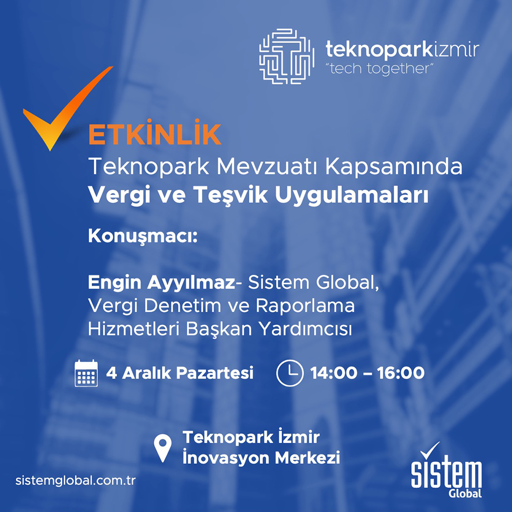 Teknopark İzmir ve Sistem Global iş birliğinde “Teknopark Mevzuatı Kapsamında Vergi ve Teşvik Uygulamaları” konulu eğitim düzenlenecektir.