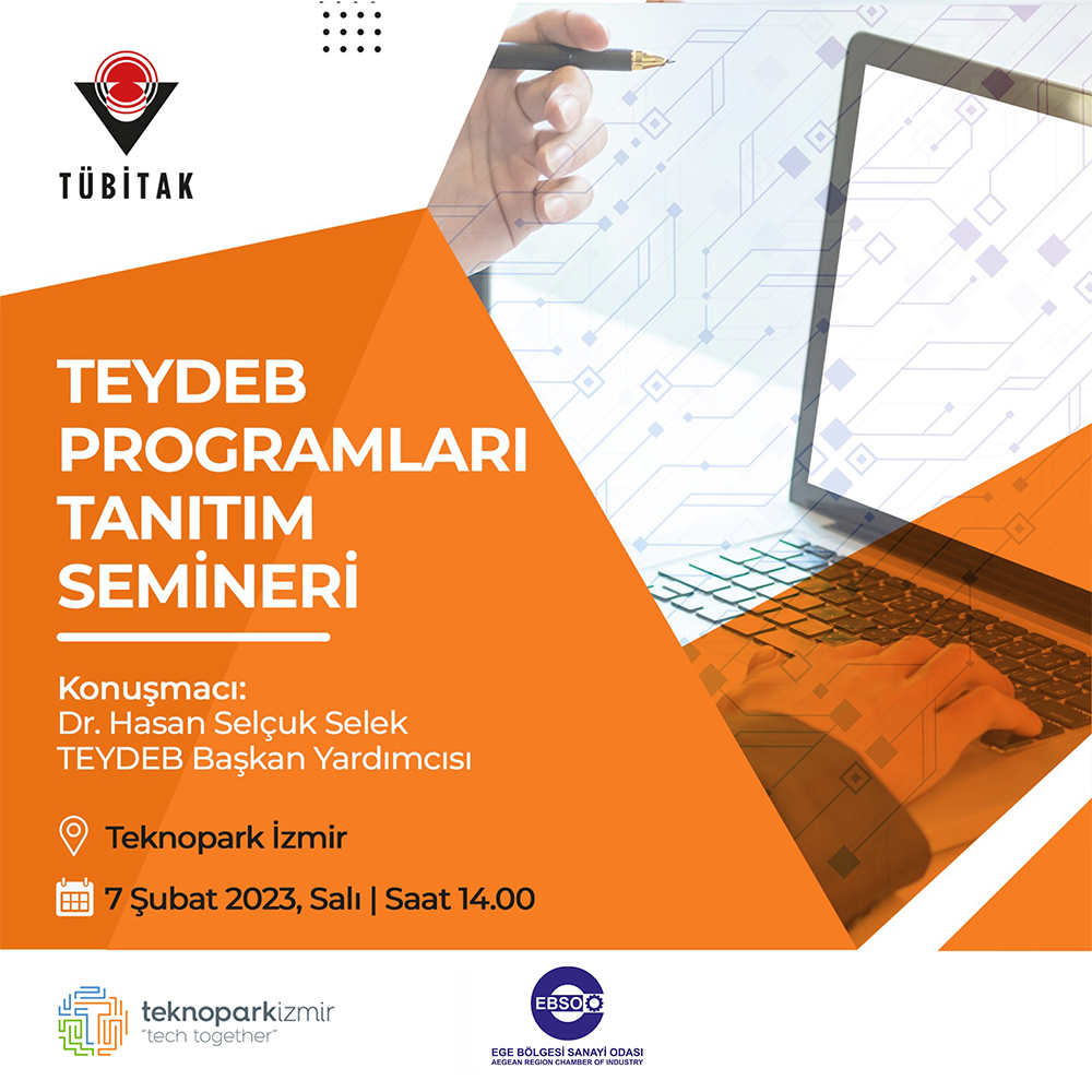 7 Şubat 2023 Salı saat 14.00’da TEYDEB Başkan Yardımcısı Dr. Hasan Selçuk SELEK katılımıyla TEYDEB Programları Tanıtım Semineri Teknopark İzmir İnovasyon Merkez’inde gerçekleştirilecektir.
